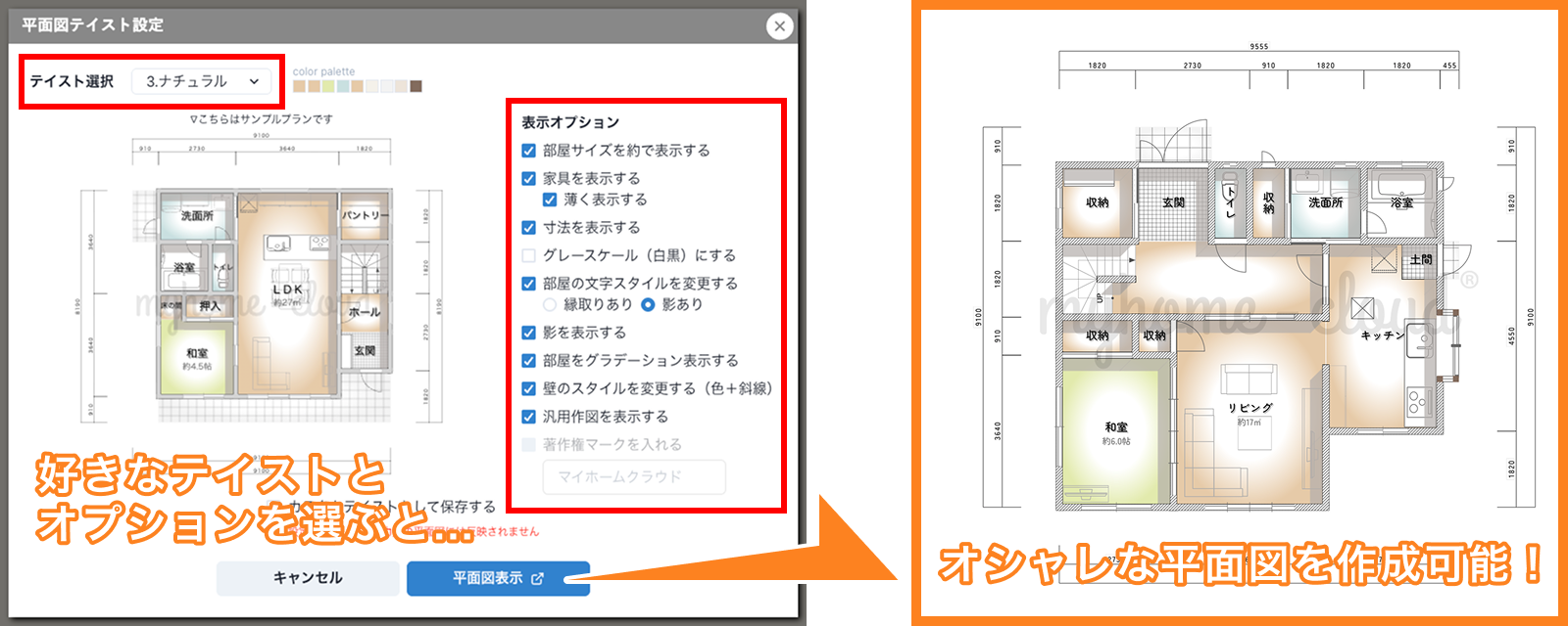 決まったフォーマットでしか出力できなかった平面図を、自分好みのテイストにカスタマイズして出力できるよう、機能拡張しました。