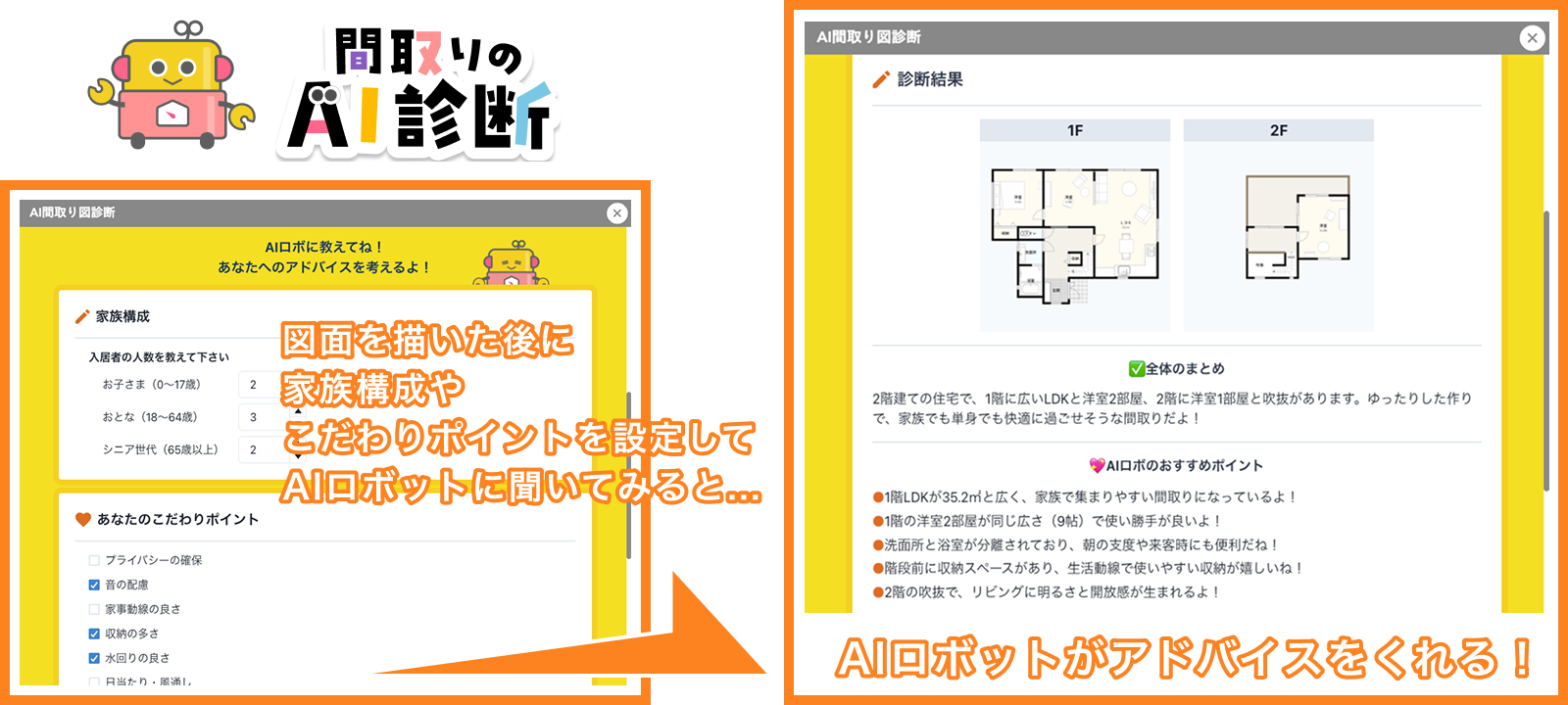 作成した図面と、家族構成やこだわりポイントを元に、AIによってその間取りを診断する機能を追加しました。